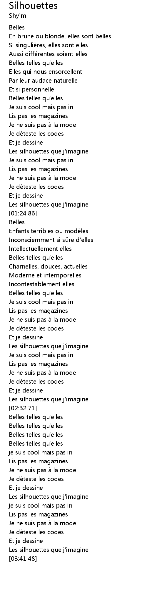 | [03:36.82] | Les silhouettes que j' imagine |