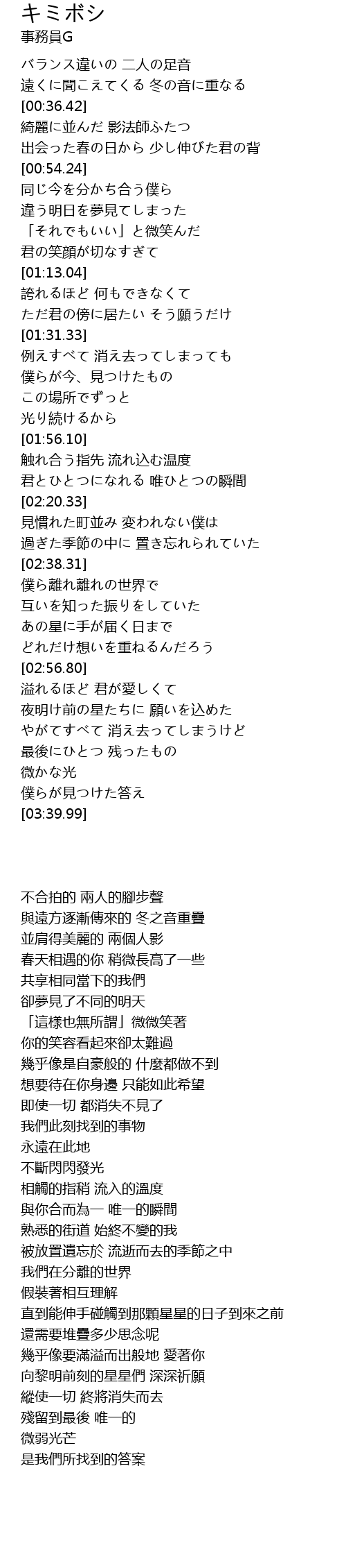 | [00:37.50] | 綺麗に並んだ 影法師ふたつ |
