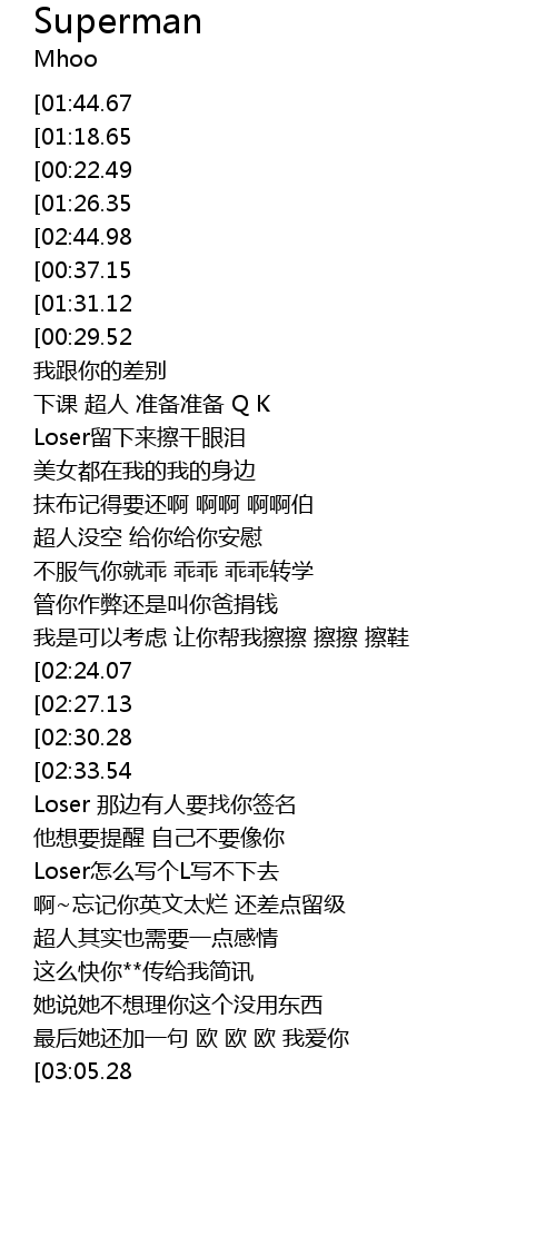 | [02:43.24][02:44.98][02:46.60][02:56.66][02:58.16][02:59.60] | year wo shi superman |