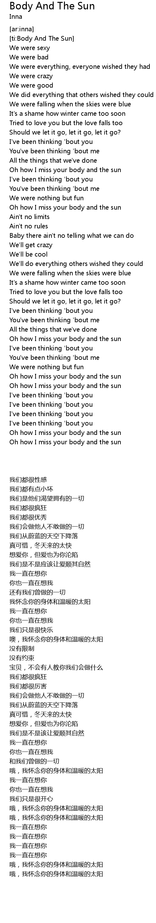 Oh how I miss your body and the sun |