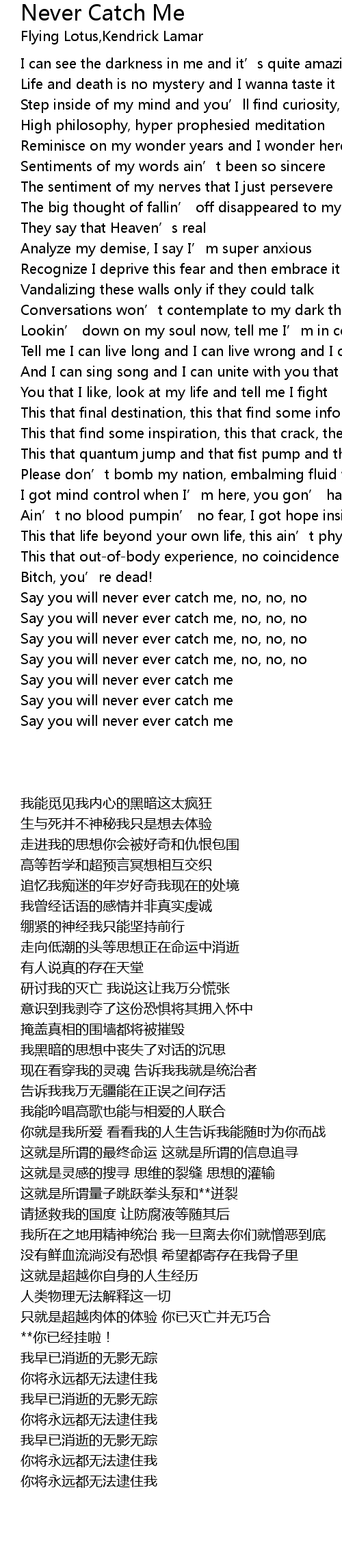 | [01:50.11] | Say you will never ever catch me, no, no, no |