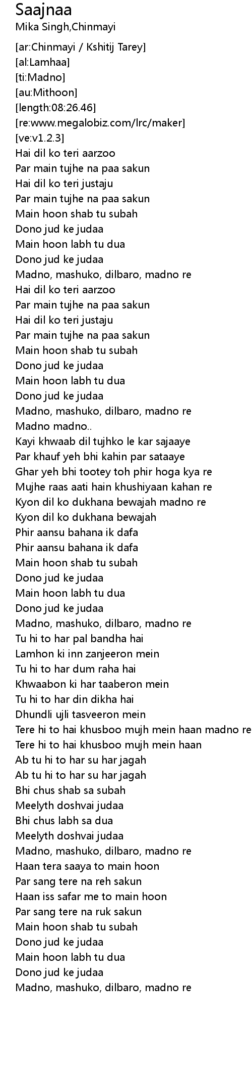 [05:51.51] Tere hi to hai khusboo mujh mein haan madno re