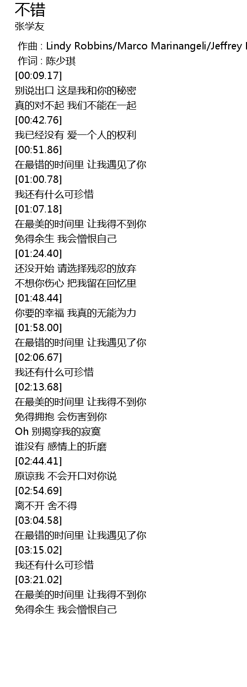 | [03:07.01] | zài zuì cuò de shí jiān lǐ ràng wǒ yù jiàn le nǐ |