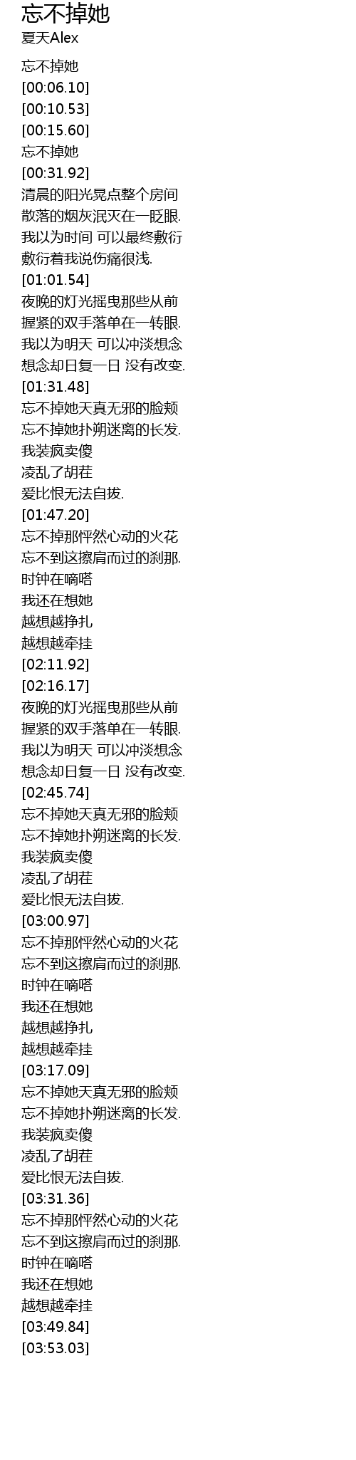 | [03:17.39] | 忘不掉她天真无邪的脸颊 |