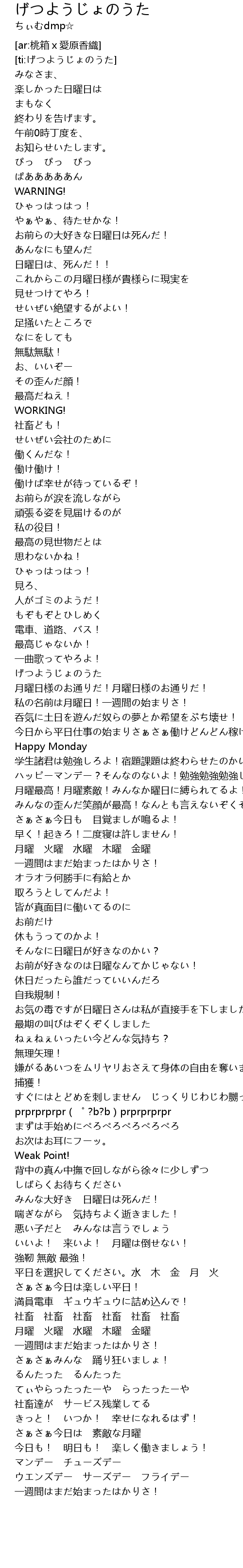 | [00:59.41] | 月曜最高!月曜素敵!みんなか曜日に縛られてるよ! |