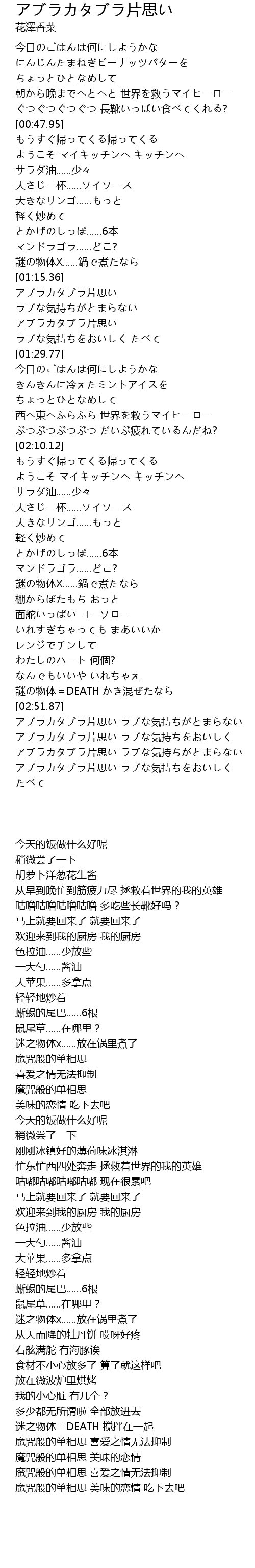 | [03:26.22] | アブラカタブラ片思い ラブな気持ちをおいしく たべて |
