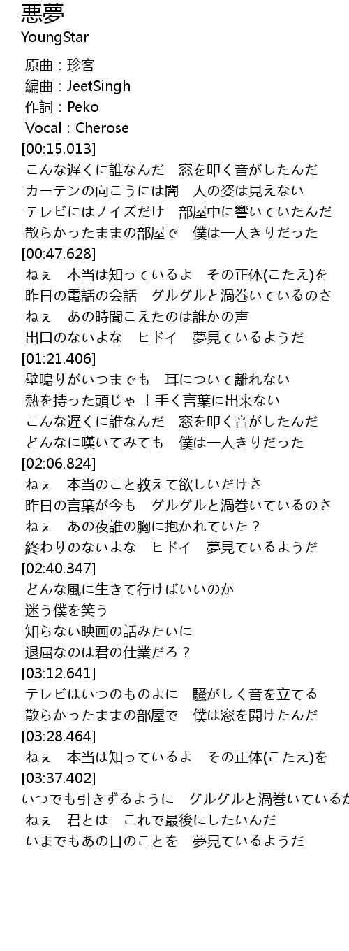 | [00:17.520] | こんな遅くに誰なんだ 窓を叩く音がしたんだ |
