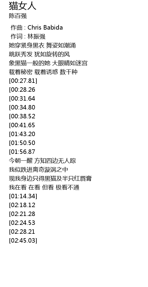 | [02:38.18][02:24.53] | 现我身边只得黑猫及半只红唇膏 |
