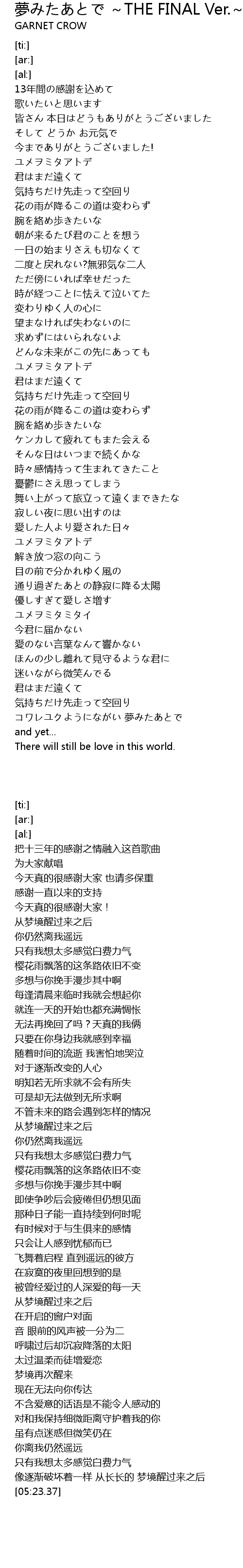 | [05:16.05] | コワレユクようにながい 夢みたあとで |