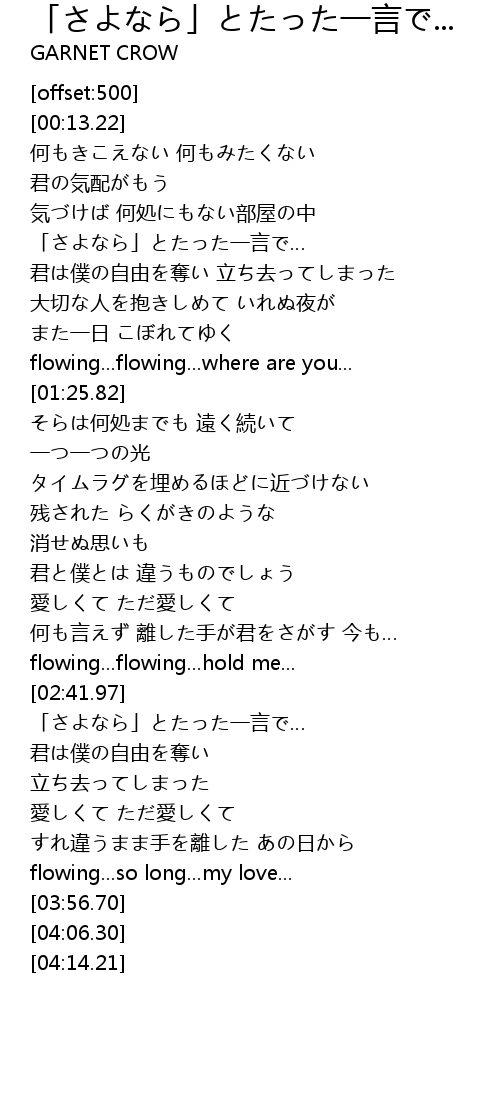 | [02:18.78] | 何も言えず 離した手が君をさがす 今も… |
