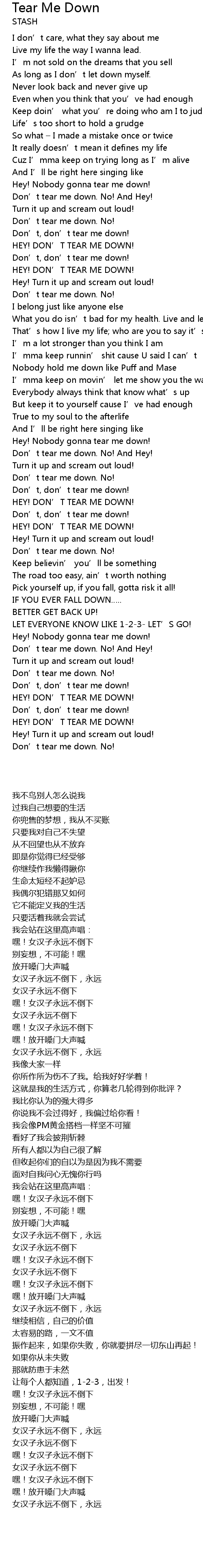 | [00:47.36] | Hey! Nobody gonna tear me down! |