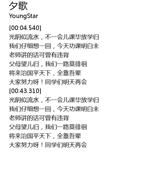 | [00:25.690] | 父母望儿归,我们一路莫徘徊 |