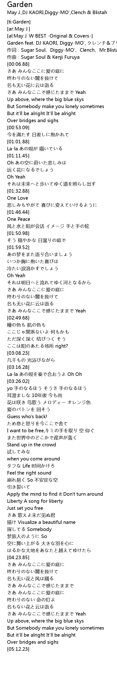 | [00:00.70] | Garden feat. DJ KAORI, Diggy-MO', クレンチ&ブリスタ - May J. |