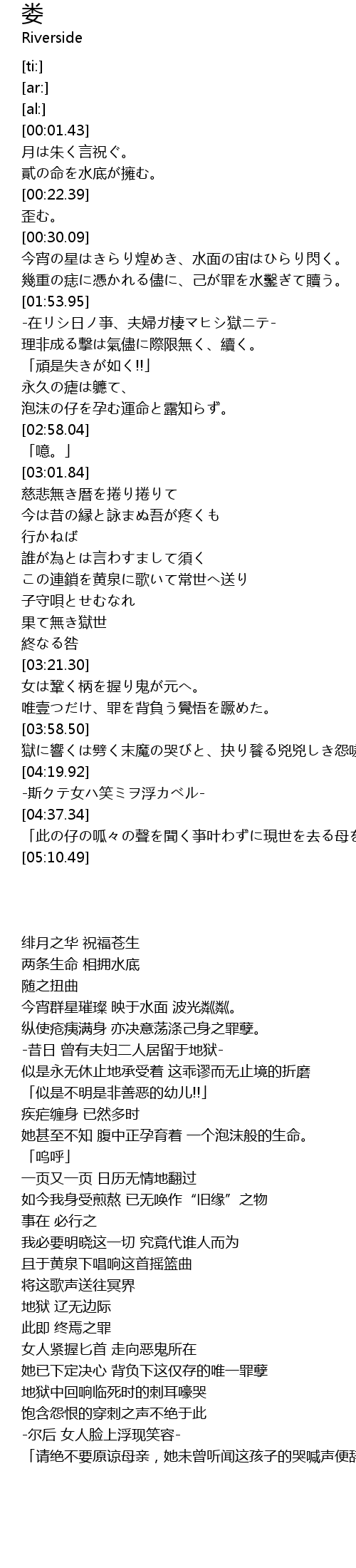 | [04:41.48] | 「此の仔の呱々の聲を聞く亊叶わずに現世を去る母を決して赦さないで。」 |