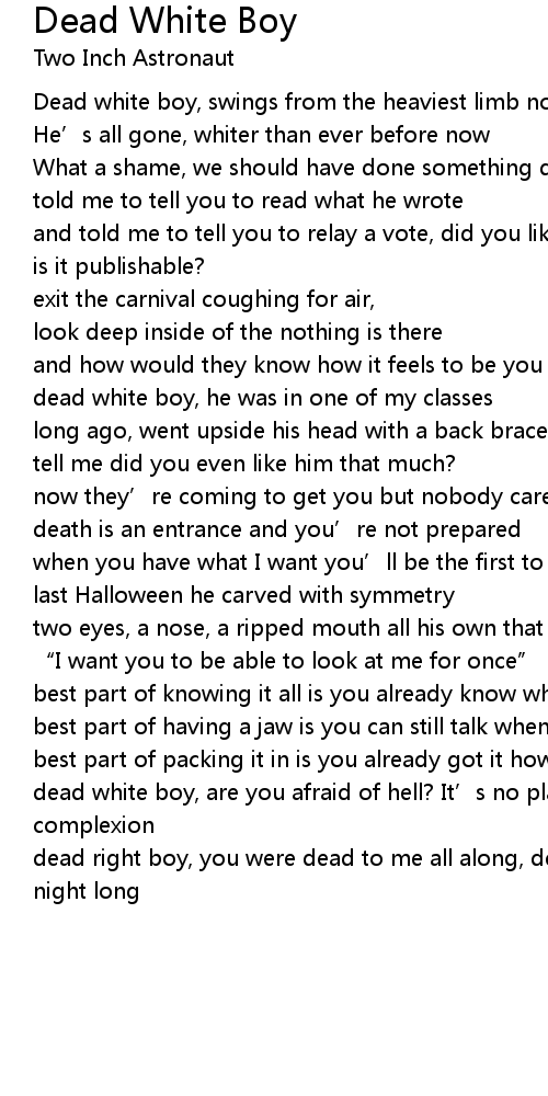 | dead right boy, you were dead to me all along, dead white boy, dead to me all night long |