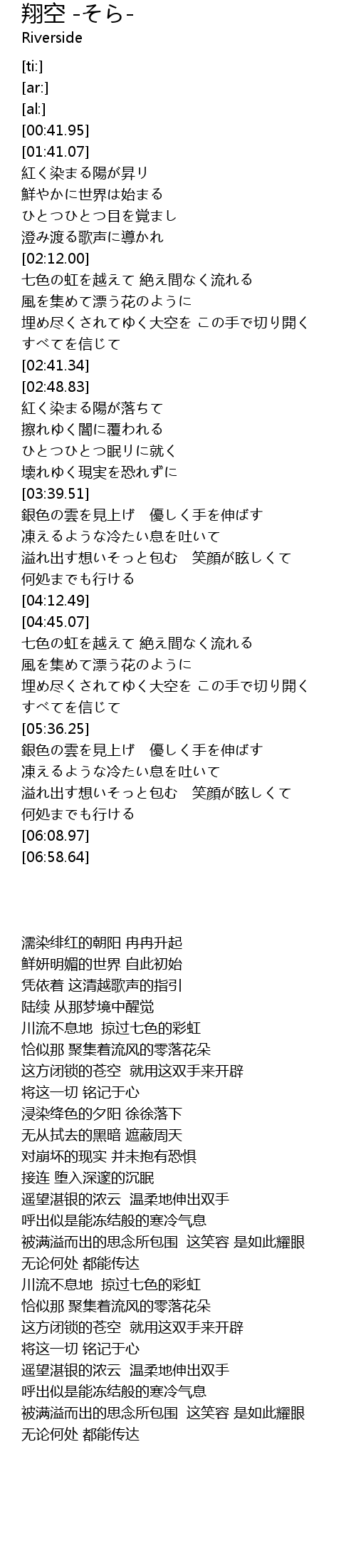 | [02:12.65] | 七色の虹を越えて 絶え間なく流れる |