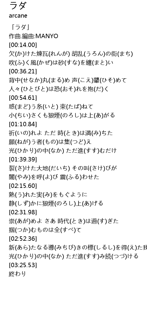 | [00:18.78] | 欠(か)けた煉瓦(れんが) 胡乱(うろん)の街(まち) |