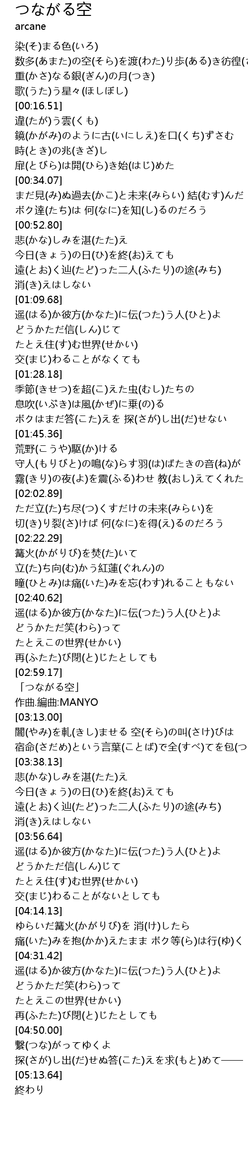 | [03:56.87] | 遥(はる)か彼方(かなた)に伝(つた)う人(ひと)よ どうかただ信(しん)じて |
