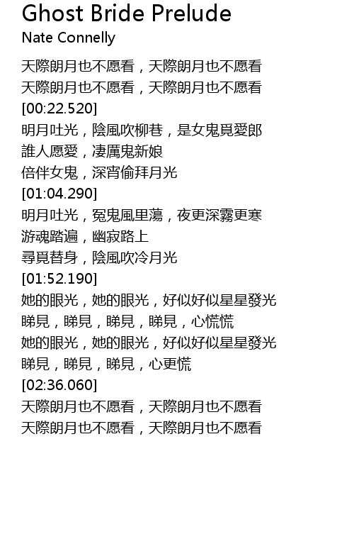 | [00:24.250] | 明月吐光,陰風吹柳巷,是女鬼覓愛郎 |