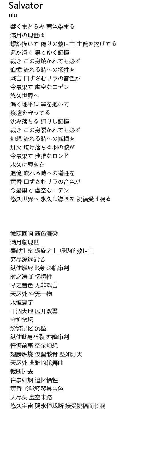 | [00:52.695] | 螺旋描いて 偽りの救世主 生贄を揭げてる |