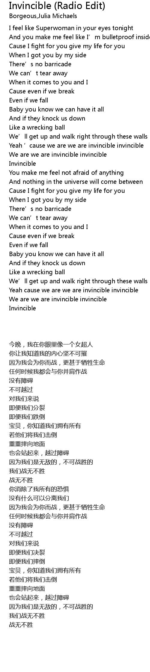 | [02:41.73] | We are we are invincible invincible |