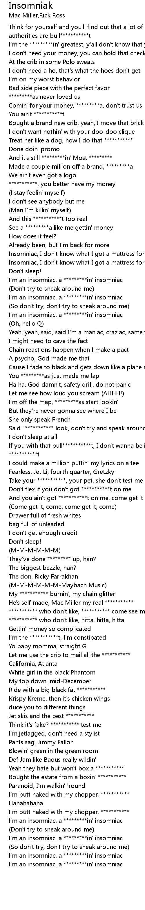 | [01:34.23] | I'm an insomniac, a *********in' insomniac |