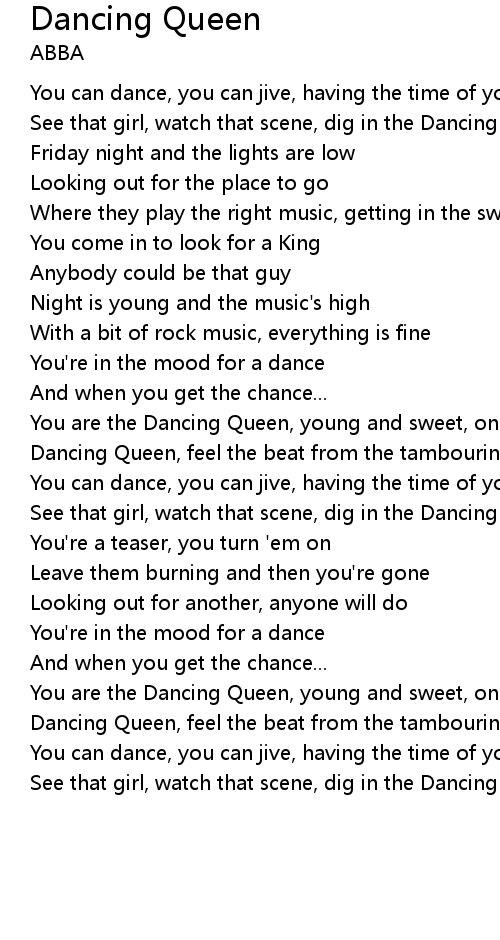 You are the Dancing Queen, young and sweet, only seventeen |