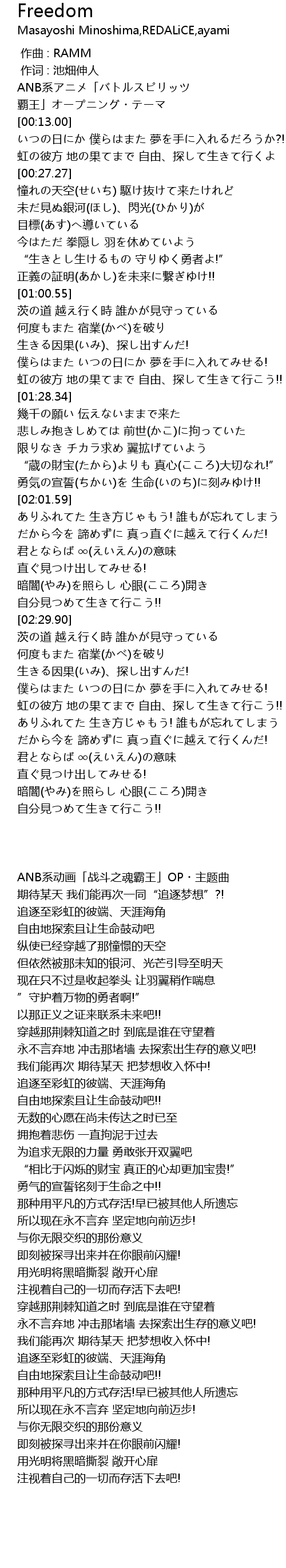 | [03:04.85] | 虹の彼方 地の果てまで 自由、探して生きて行こう!! |