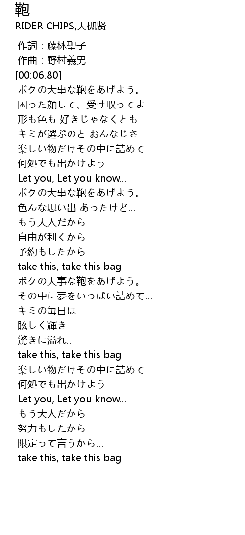 | [01:21.56] | ボクの大事な鞄をあげよう。 |