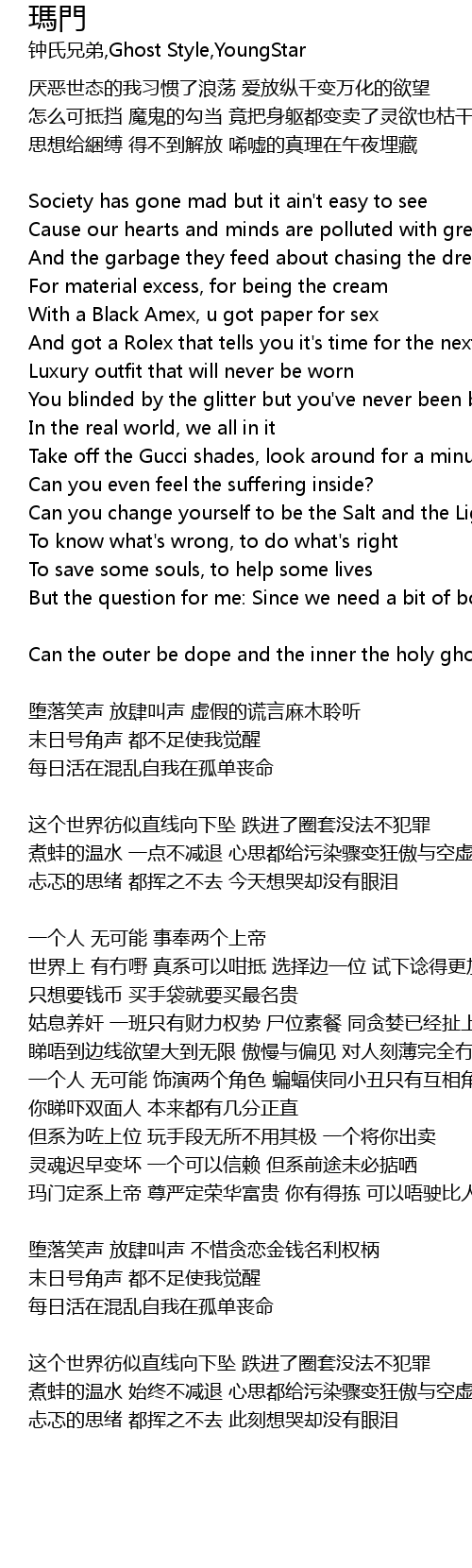 但系为咗上位 玩手段无所不用其极 一个将你出卖 灵魂迟早变坏 一个可以信赖 但系前途未必掂哂 玛门定系上帝 尊严定荣华富贵 你有得拣 可以唔驶比人控制