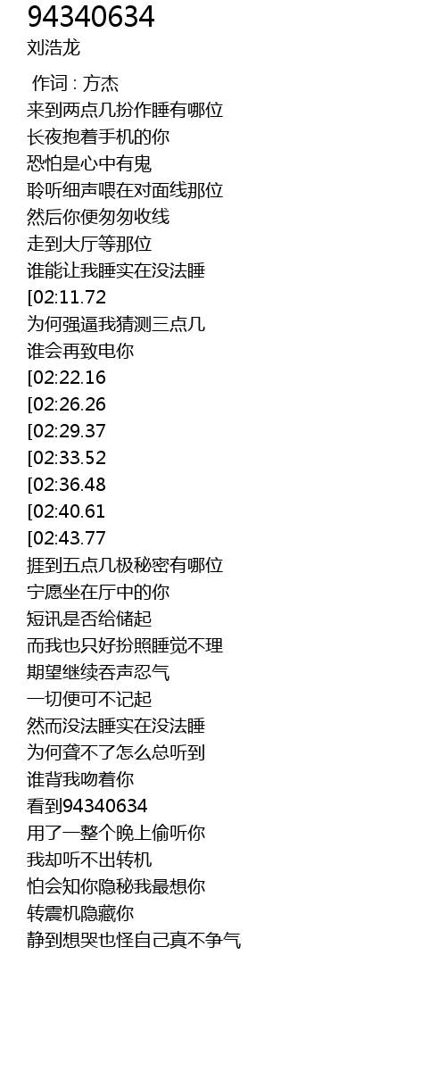 | [00:56.20][02:22.16] | 看到9434 0634 |
