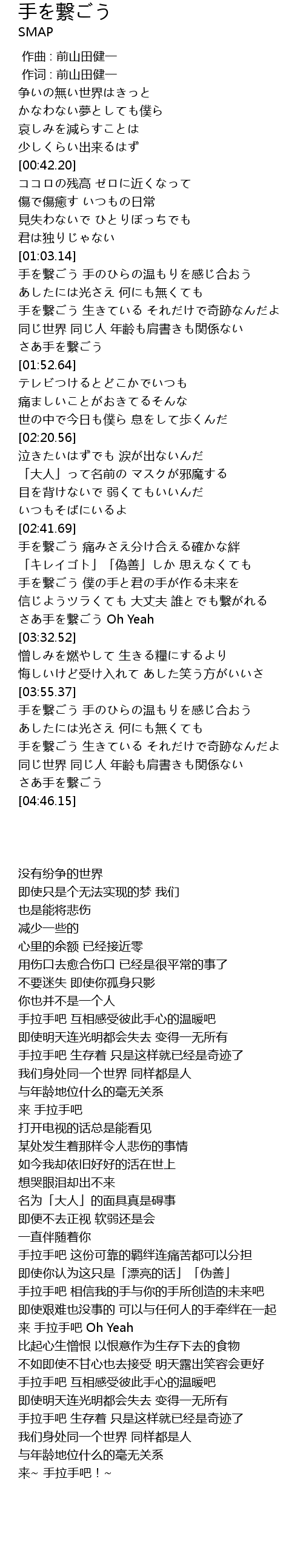 | [03:56.98] | 手を繋ごう 手のひらの温もりを感じ合おう |