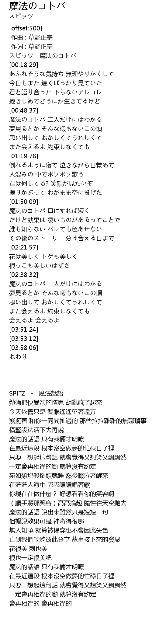 | [00:00.00] | スピッツ - 魔法のコトバ |