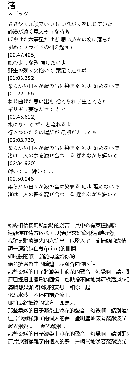 | [02:20.737] | 渚は二人の夢を混ぜ合わせる 揺れながら輝いて |