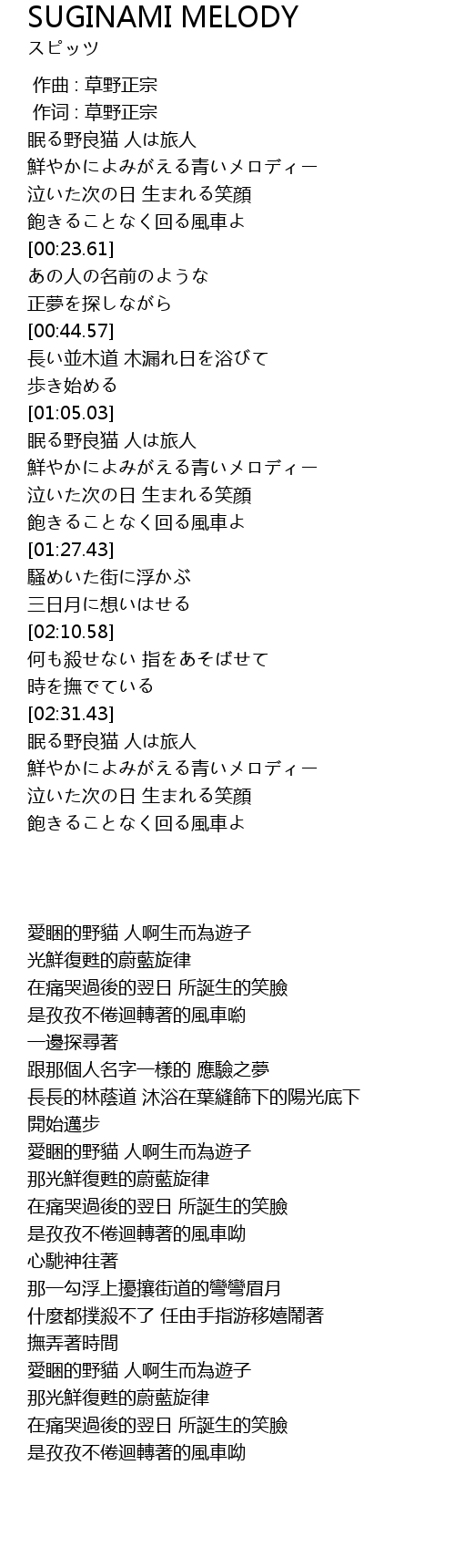 | [02:34.42] | 眠る野良猫 人は旅人 |