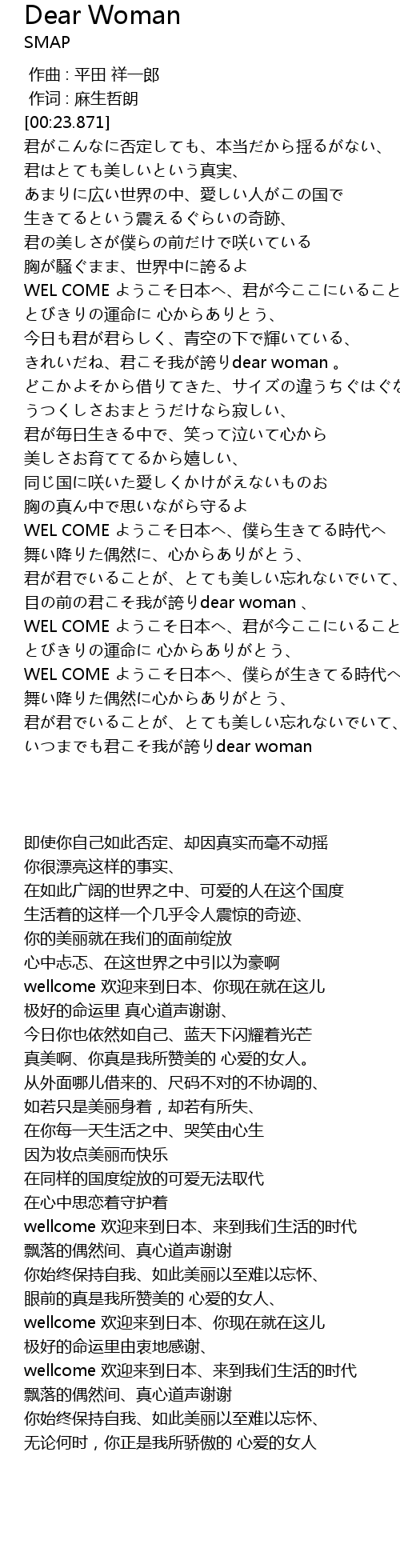 | [03:04.233] | mù qián jūn wǒ kuā dear woman |