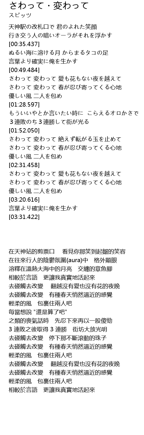 | [02:56.041] | さわって 変わって 春が忍び寄ってくる心地 |