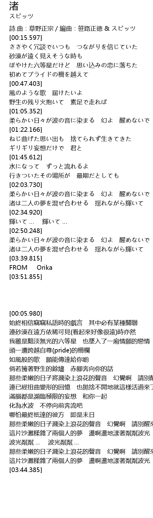 | [03:22.963] | 渚は二人の夢を混ぜ合わせる 揺れながら輝いて |