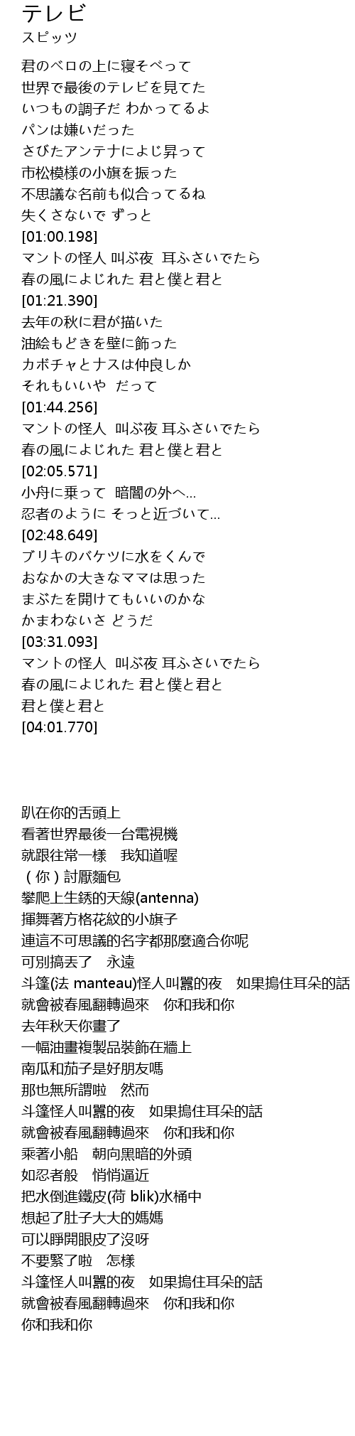 | [01:44.410] | マントの怪人 叫ぶ夜 耳ふさいでたら |