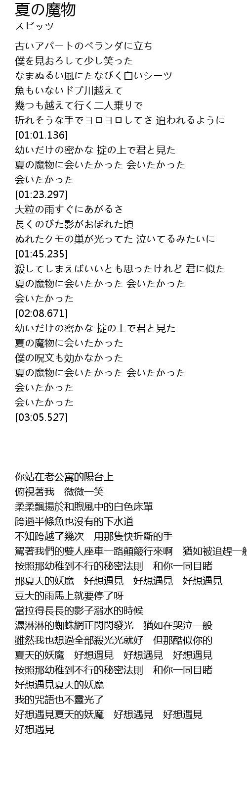 | [01:55.267] | 夏の魔物に会いたかった 会いたかった 会いたかった |