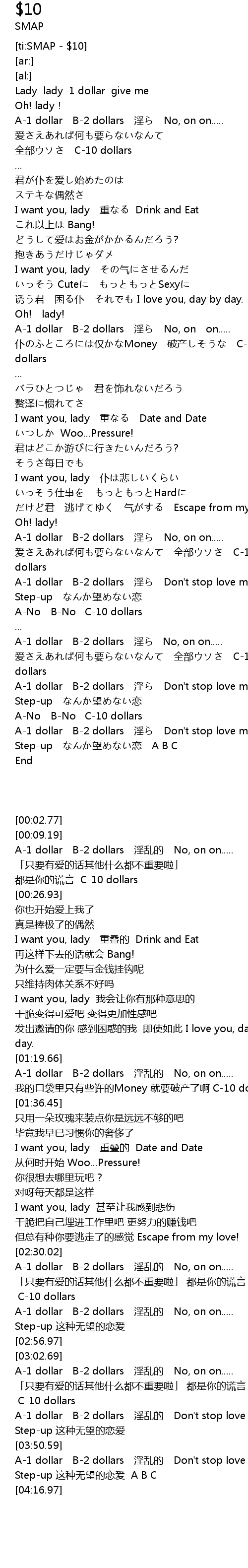 | [00:10.75] | A1 dollar B2 dollars yín No, on on..... |