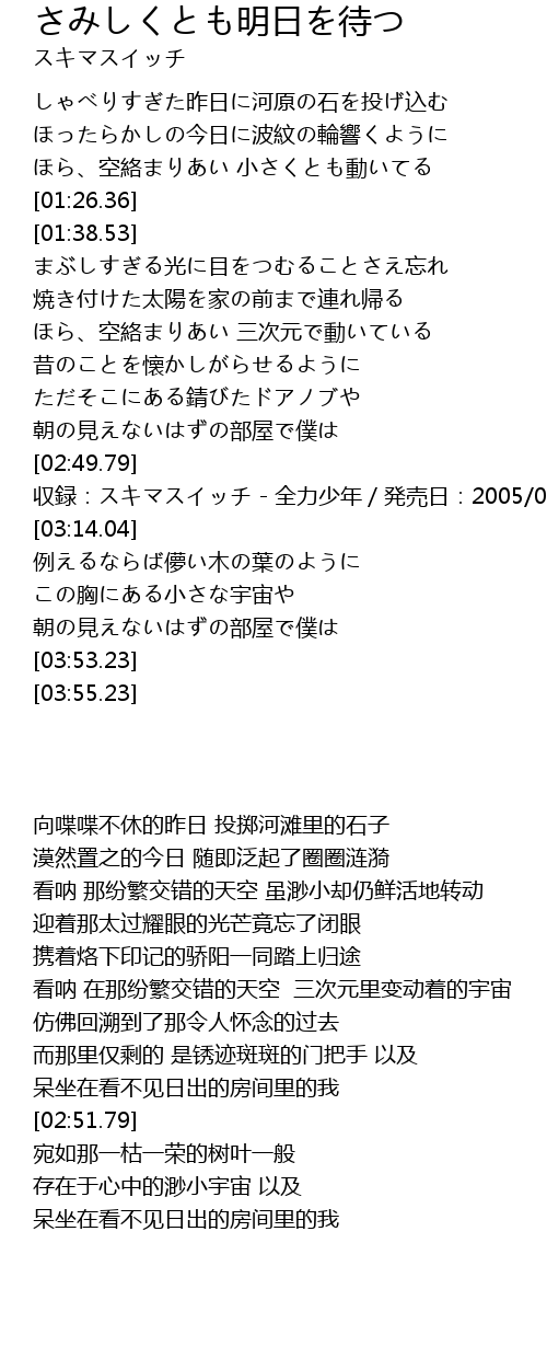 | [03:37.84] | 朝の見えないはずの部屋で僕は |