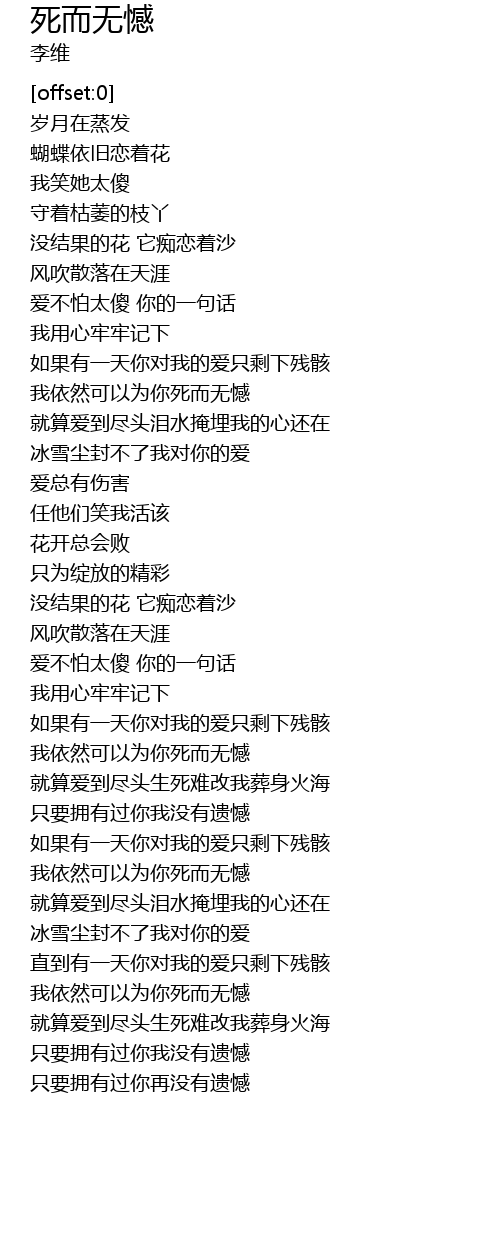 | [03:06.23] | wǒ yī rán kě yǐ wéi nǐ sǐ ér wú hàn |