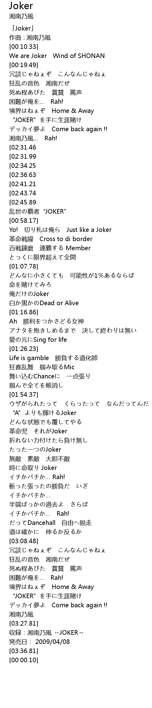 | [03:30.81] | 収録:湘南乃風 ~JOKER~ |