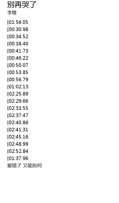 | [03:16.21][02:25.89][01:04.58] | 别再哭了 多不值得 |