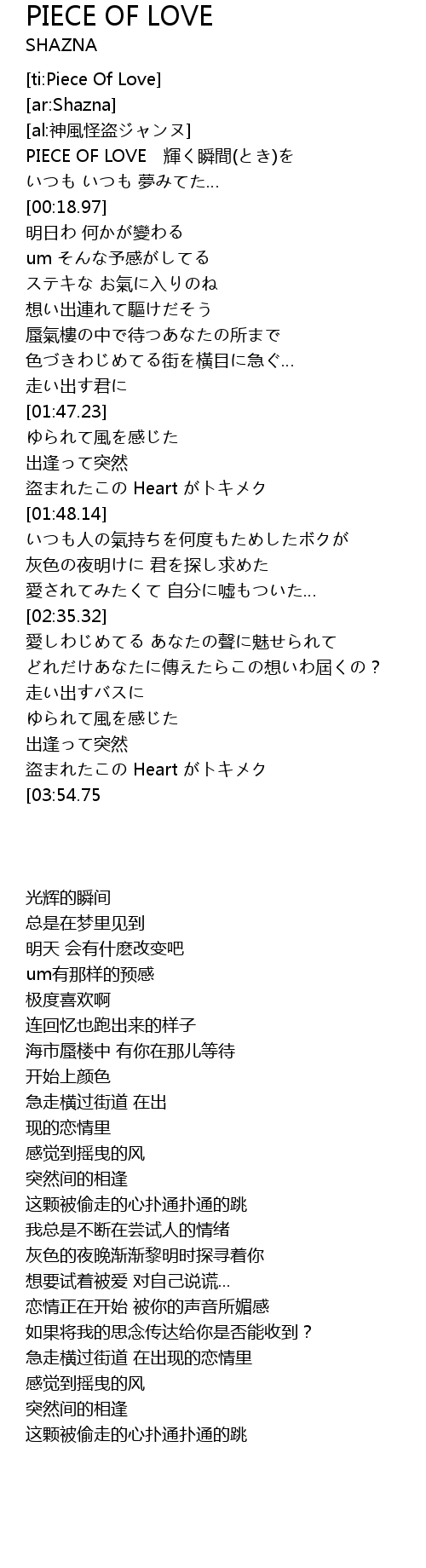 | [00:01.55] | PIECE OF LOVE huī shùn jiān |