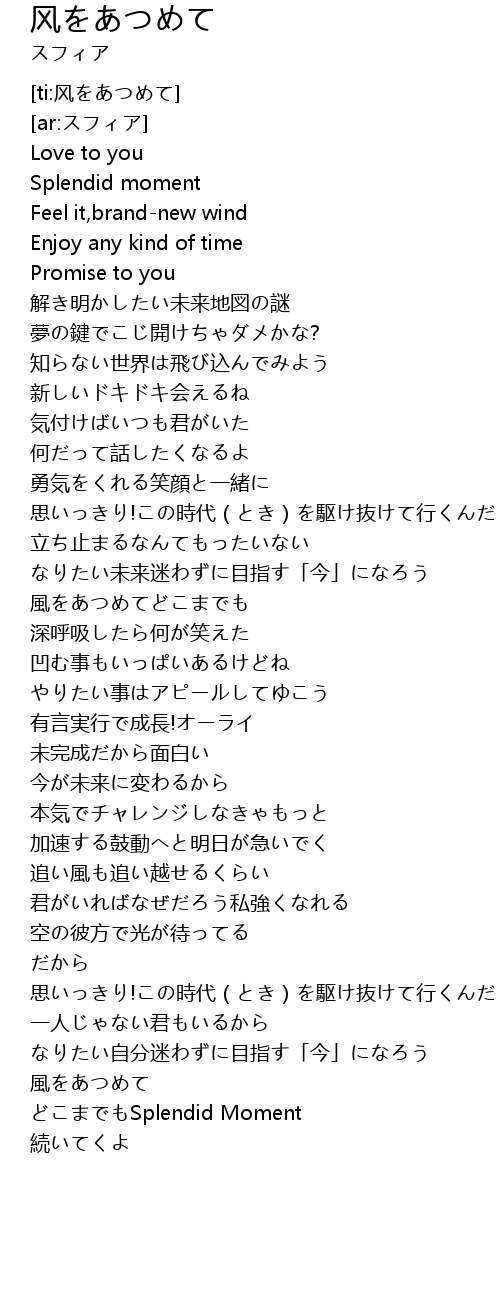 | [01:44.310] | 風をあつめてどこまでも |