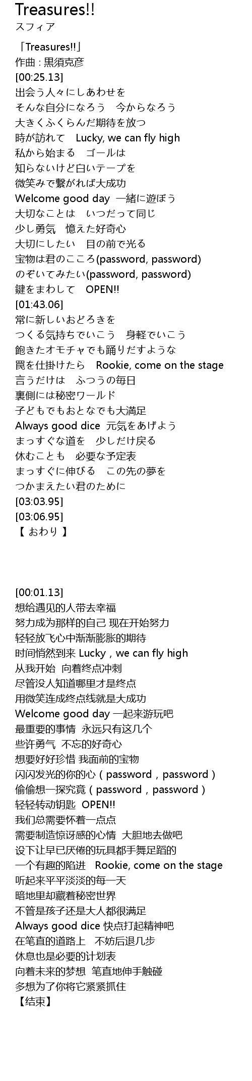 | [01:29.89] | 宝物は君のこころ(password, password) |