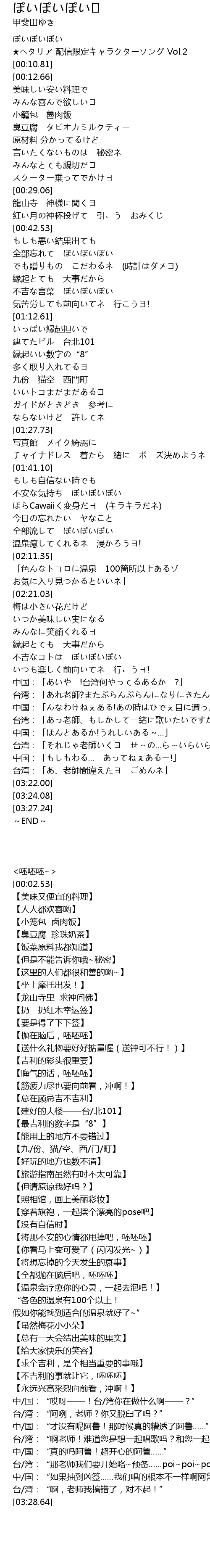 | [00:02.53] | ★ヘタリア 配信限定キャラクターソング Vol.2 |
