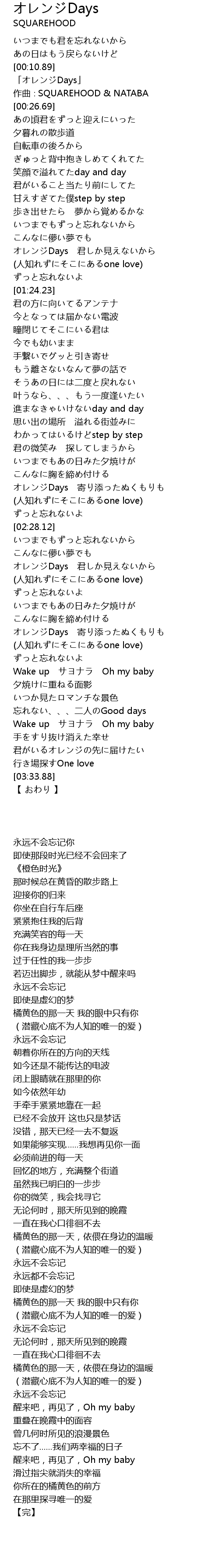 | [02:18.35] | オレンジDays 寄り添ったぬくもりも |